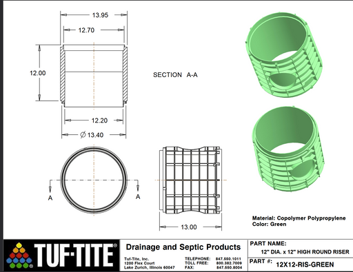 View full detailsKey Features Specs Warranty The Tuf-Tite 24" x 12" septic tank riser raises your septic system access point to ground level, making inspectio...