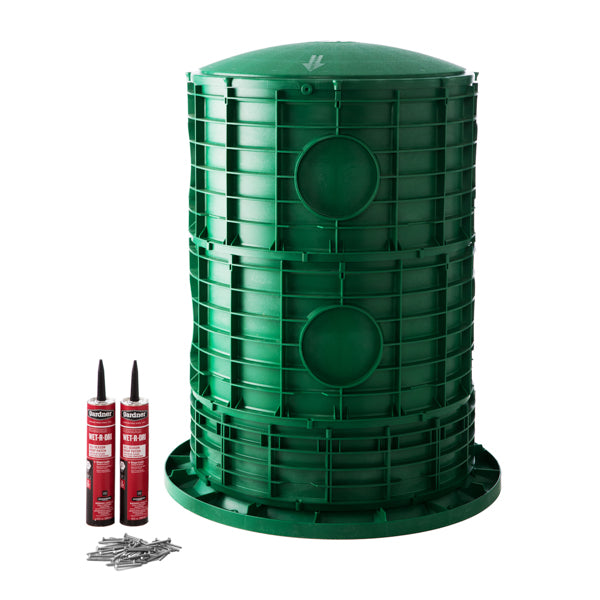 This kit includes a 20" diameter riser, a secure cover, and all necessary installation hardware. Each component is made from heavy-duty, UV-resistant polyethylene, designed to withstand outdoor exposure, moisture, and long-term soil contact without rusting or corroding. The fitted cover helps protect against water intrusion and restrict unauthorized access.