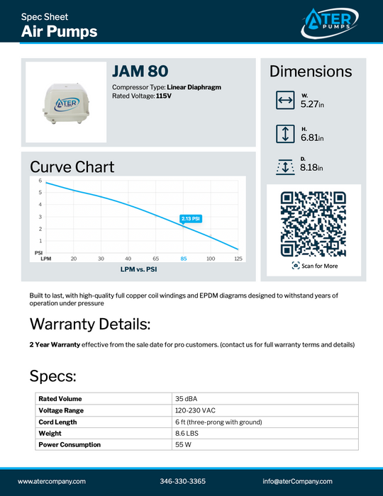 Not only is the JAM-80 efficient and durable, but it's also easy to service and maintain. Its quiet operation at just 34db and automatic pressure limitation make it a hassle-free addition to your septic system. And with a UL outdoor rating and over-pressurization protection, you can rest easy knowing that your system is safe and secure. Upgrade to the Ater JAM-80 Septic Air Pump and enjoy long-lasting, reliable performance for years to come.