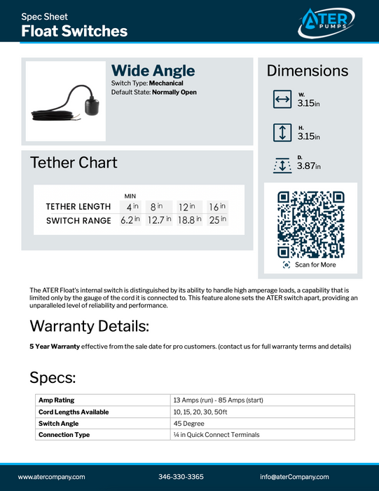 With a run current of 13 amps and a max pump starting current of 85 amps, this float switch is a powerhouse that can handle up to 1 HP at 230 VAC or 1/2 HP at 120 VAC. The 20' cord and high-impact, corrosion-resistant PVC housing make it perfect for use in a wastewater environment. Not only is this float switch durable and reliable, but it is also UL Recognized and CSA Certified, giving you peace of mind that it meets the highest safety standards. And with a 5-Year Limited Warranty, you can trust that this float switch will provide you with long-lasting performance. Upgrade your wastewater pumping system with the ATER