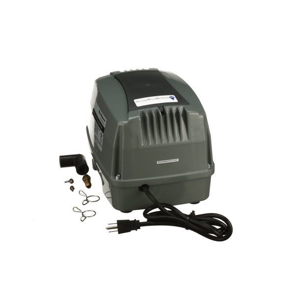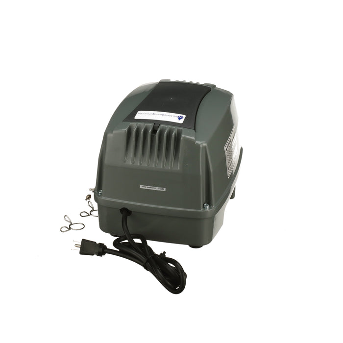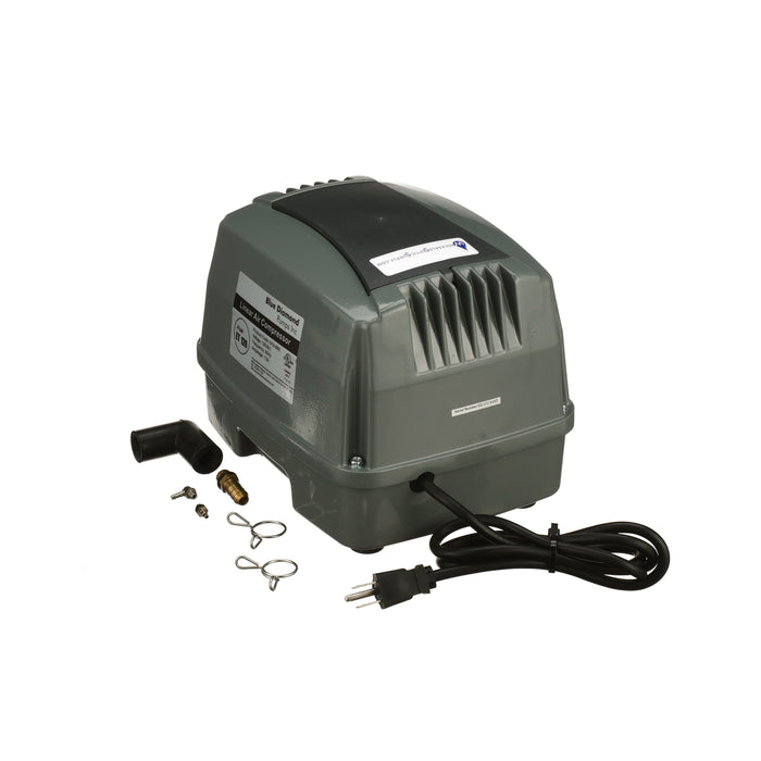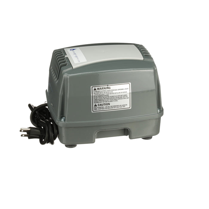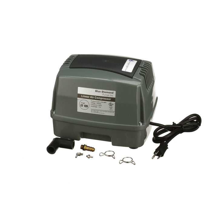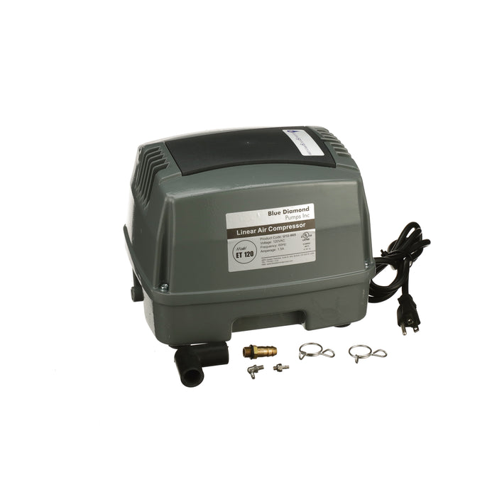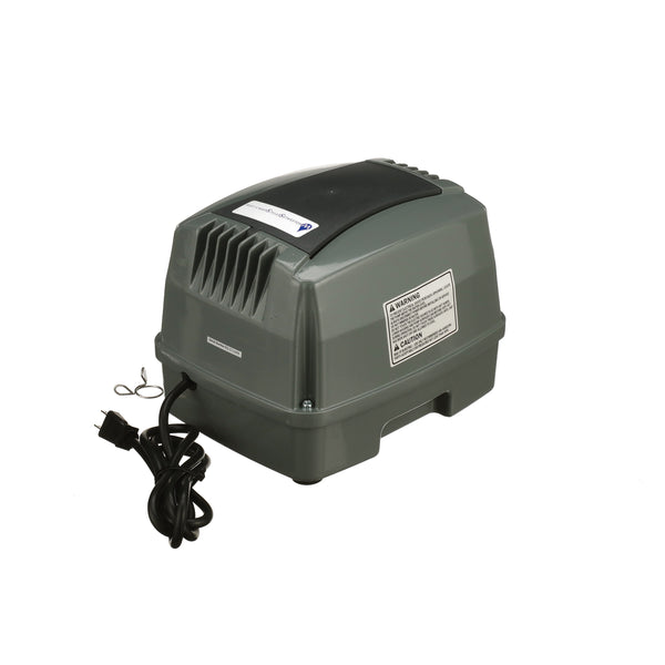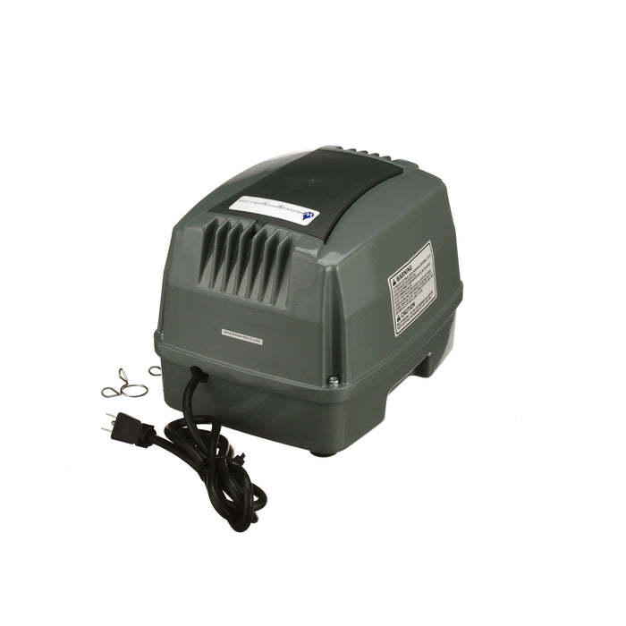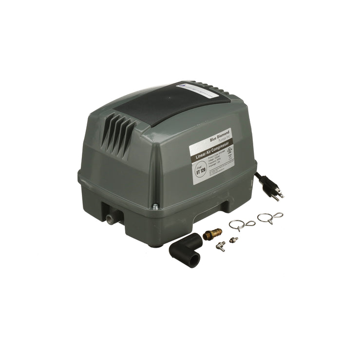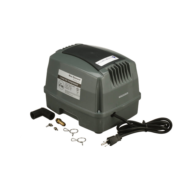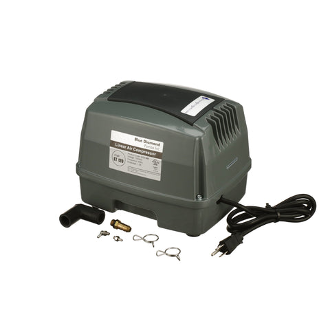The Blue Diamond ET120 produces 120 liters of air per minute, guaranteeing your aerobic septic system will effectively manage waste. As oxygen pumps into your wastewater, it will break down waste into manageable bits and help the waste destroying bacteria in the tank thrive. The Blue Diamond ET120’s high flow rate will increase levels of oxygen in your wastewater and keep your drainage clear, reducing the amount of effluent that drains from your septic system. This air pump has no wearing parts, so you can be sure that the air pump is operating at peak efficiency without sacrificing performance. These specific pumps are not to be used on ponds over 5 foot in depth as the back pressure will ruin them, as it is not good for them.