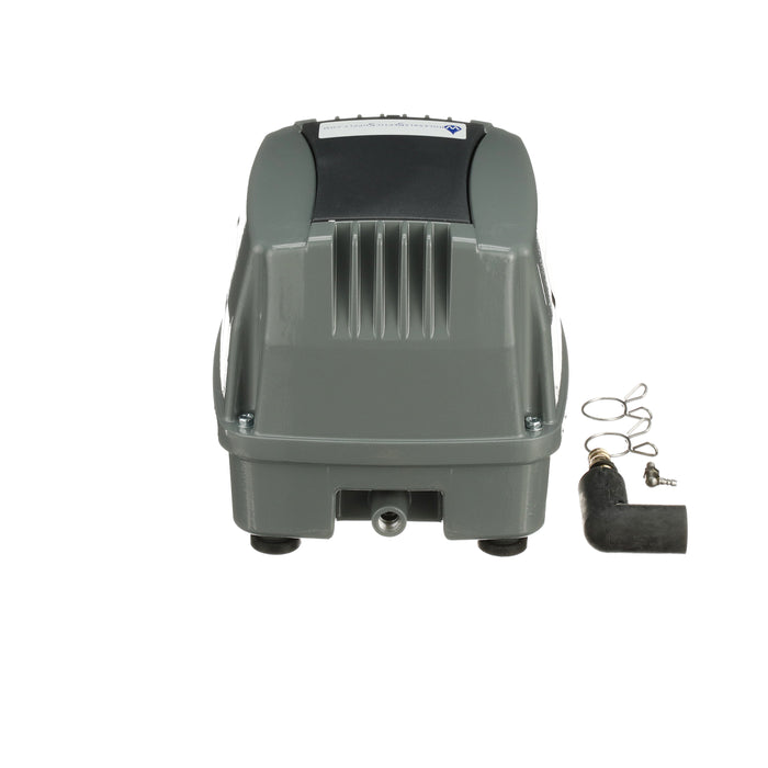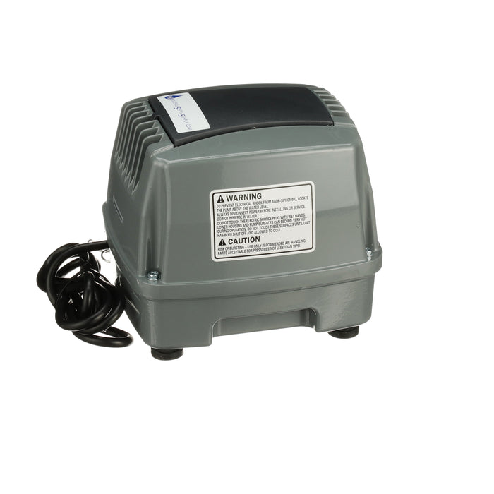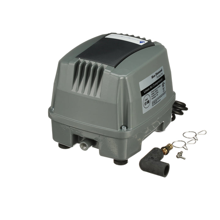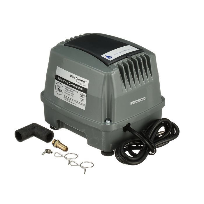 The Blue Diamond ET80 Septic Air Pump has an air flow of 80 liters per minute, and it can handle over 500 gallons of water each day. This air flow means that a lot of oxygen is being pumped into the wastewater to help destroy effluent and sewage, allowing clear drainage to be released into the environment. This pump is designed to be able to run all day if necessary, and it has no wearing parts so it does not compromise performance. In addition to being one of the most commonly used aerators in the United States, this air pump is used by NSF certified residential sewage treatment system manufacturers. Choose effective, strong performance with the Blue Diamond ET80. These specific pumps are not to be used on ponds over 5 foot in depth as the back pressure will ruin them, as it is not good for them. Blue Diamond aerators noise level is higher than other comparable linear diaphragm aerators.