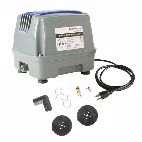 With aluminum, weatherproof casing, and special diaphragm material, the Blue Diamond ET80 Septic Air Pump is built to last. This pump is well suited for outdoor use, and is UL, TUV, and CE approved. If the diaphragm or any other part of this pump needs to be rebuilt, there are easy to use, affordable rebuild kits available. Your wallet will thank you when you save hundreds of dollars on replacing your septic system or air pump because you have the long-lasting, durable Blue Diamond ET80.