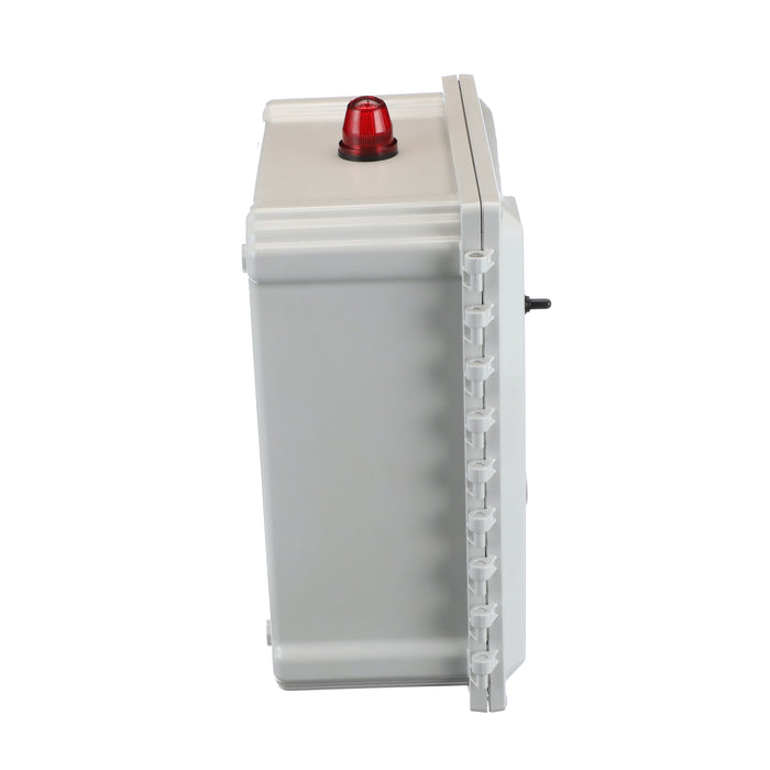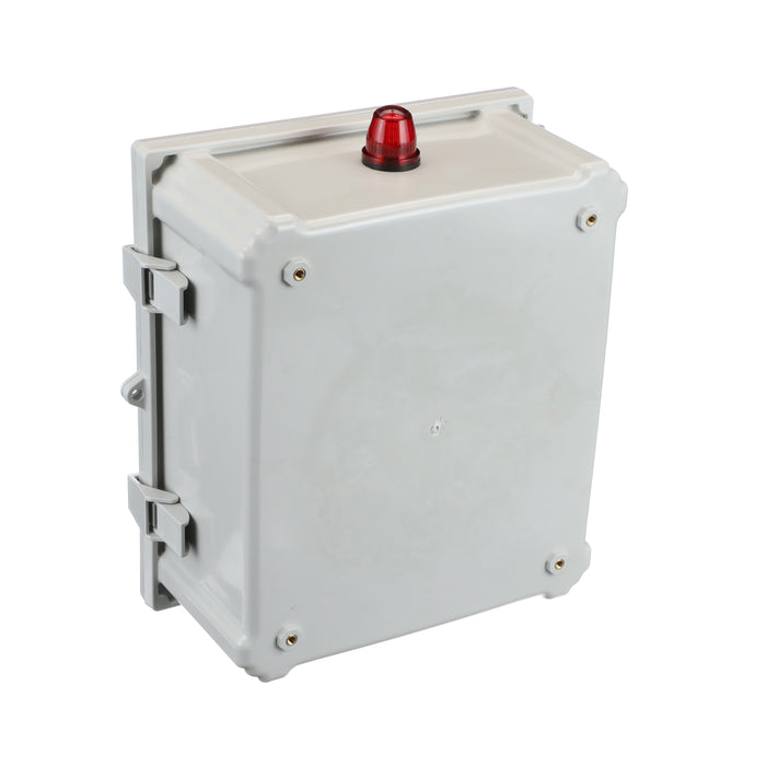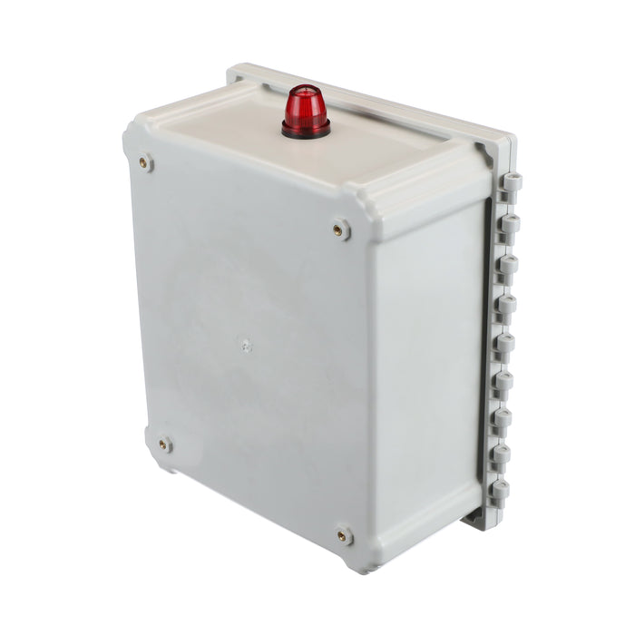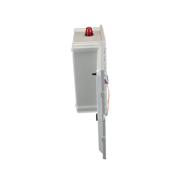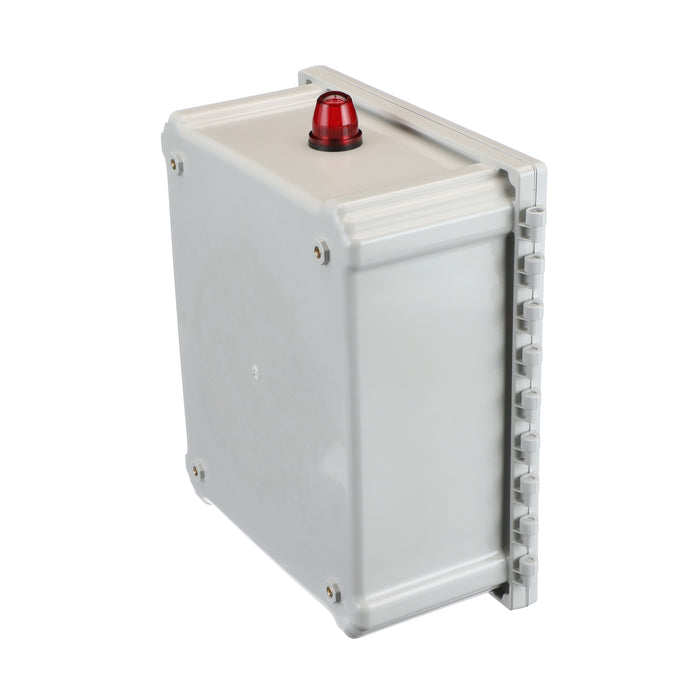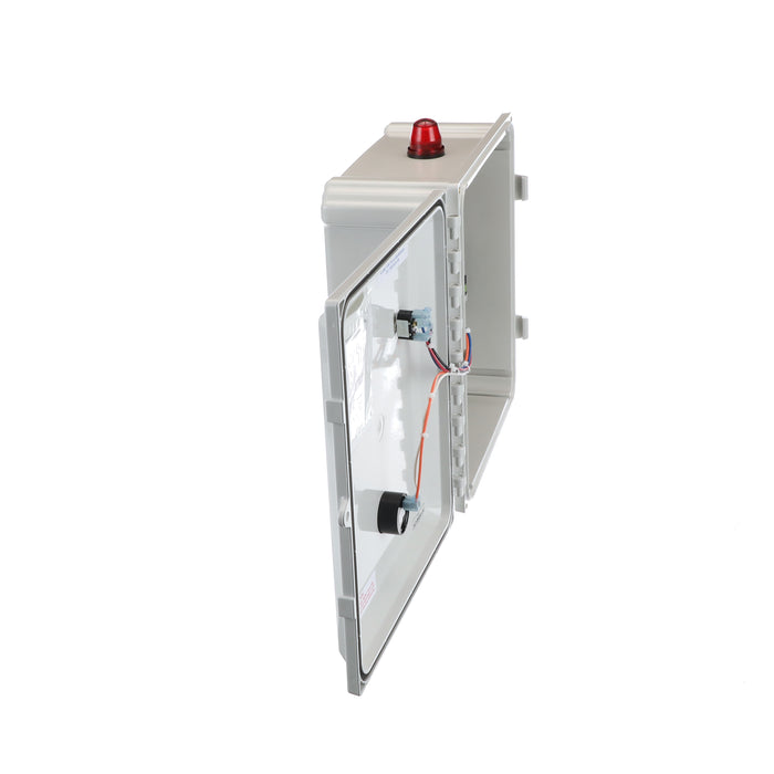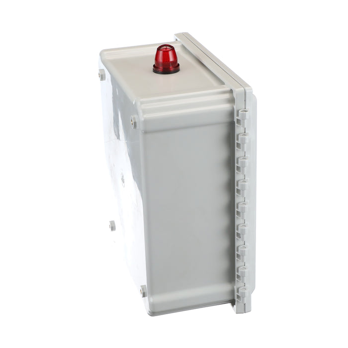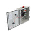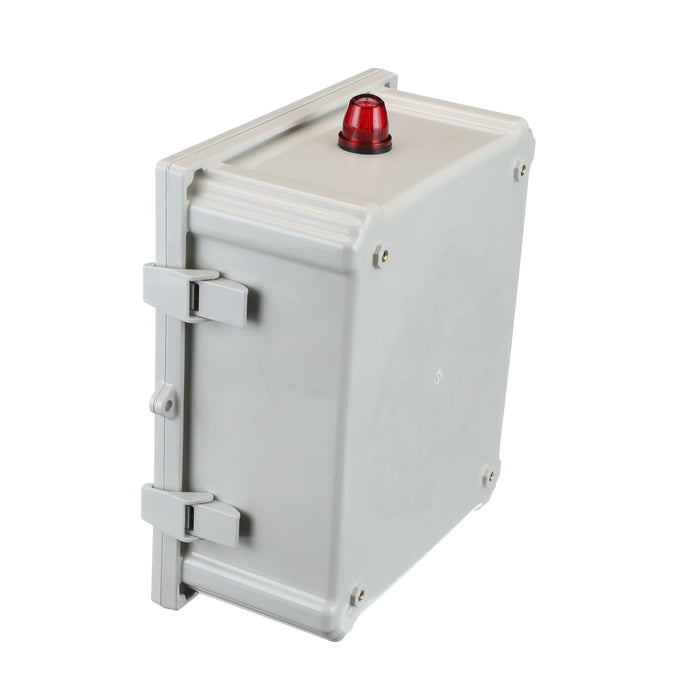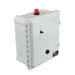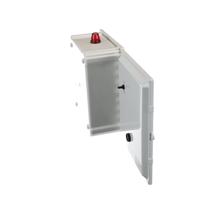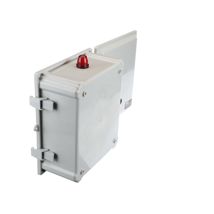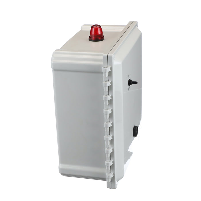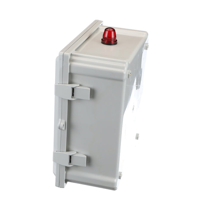 The enclosure has a NEMA rating of 4X which provides protection from falling dirt, falling liquids, hose-directed water and corrosive agents. The 14”x12”x6” enclosure is made of Polycarbonate and has a hinged lockable door with latches and included screws to secure the door if required. All electrical components are mounted inside the enclosure on an aluminium back plate.