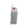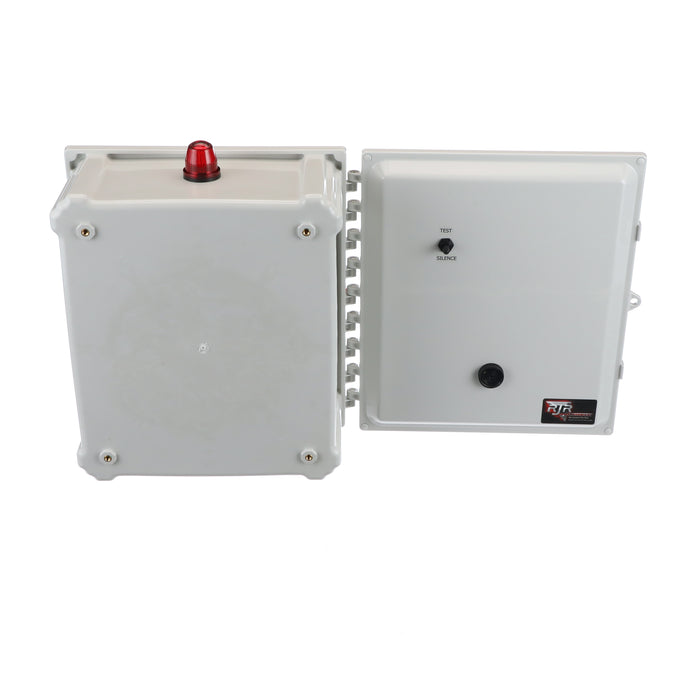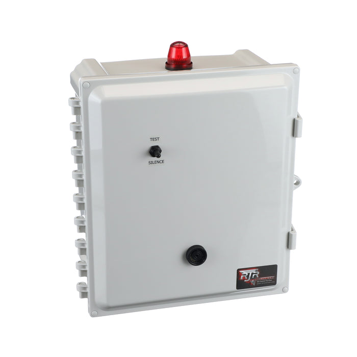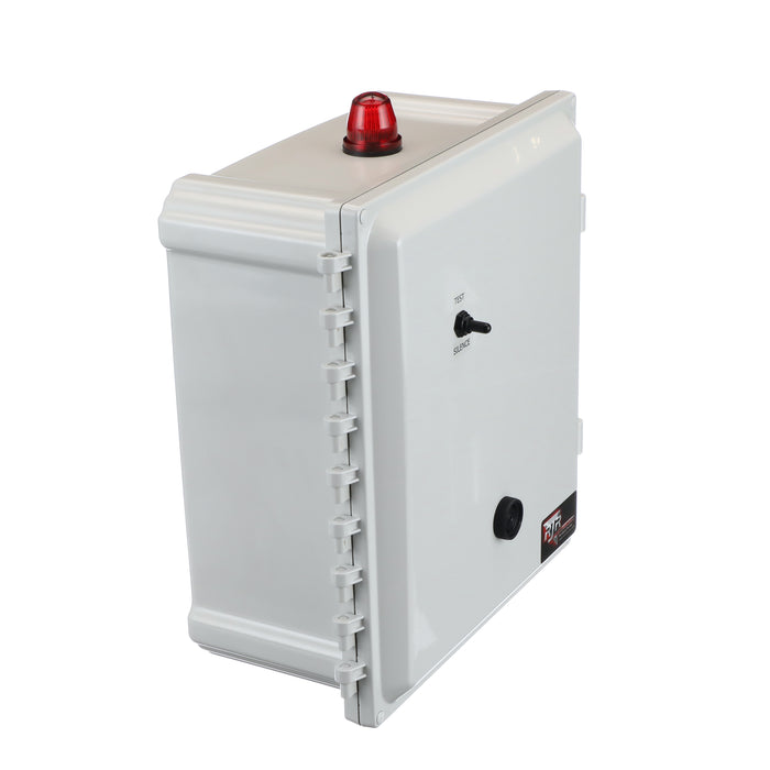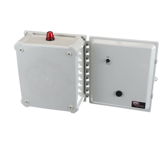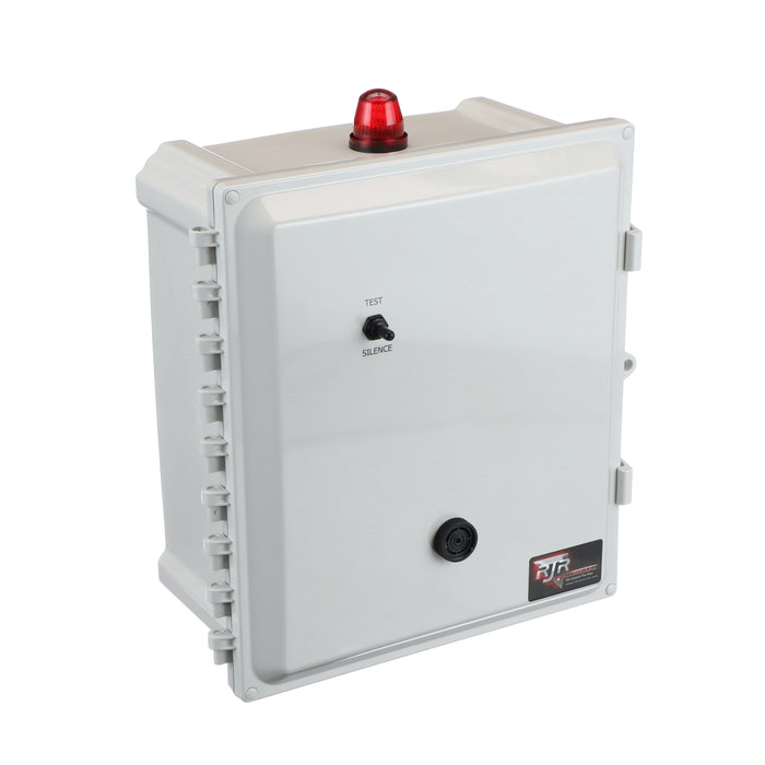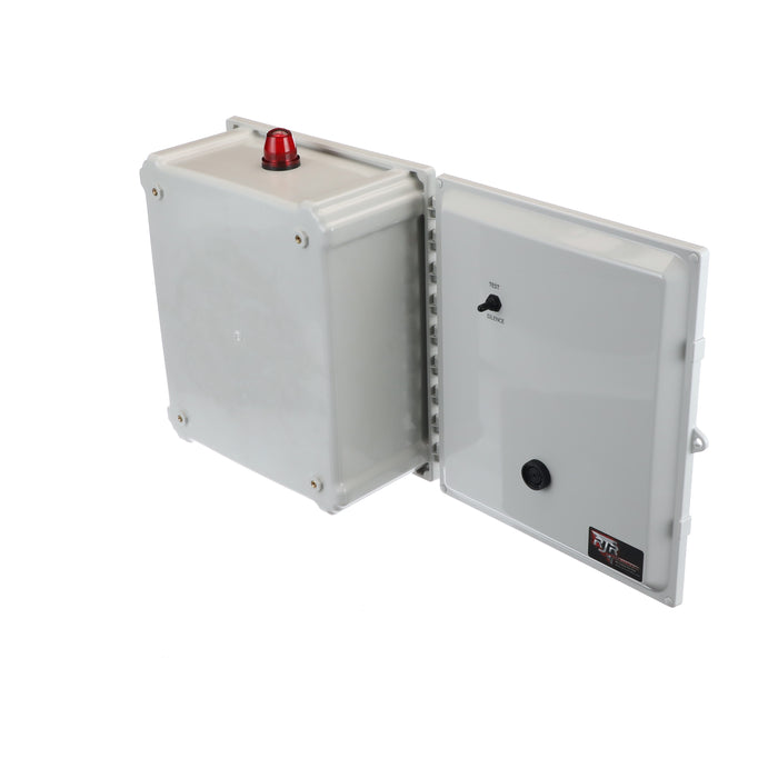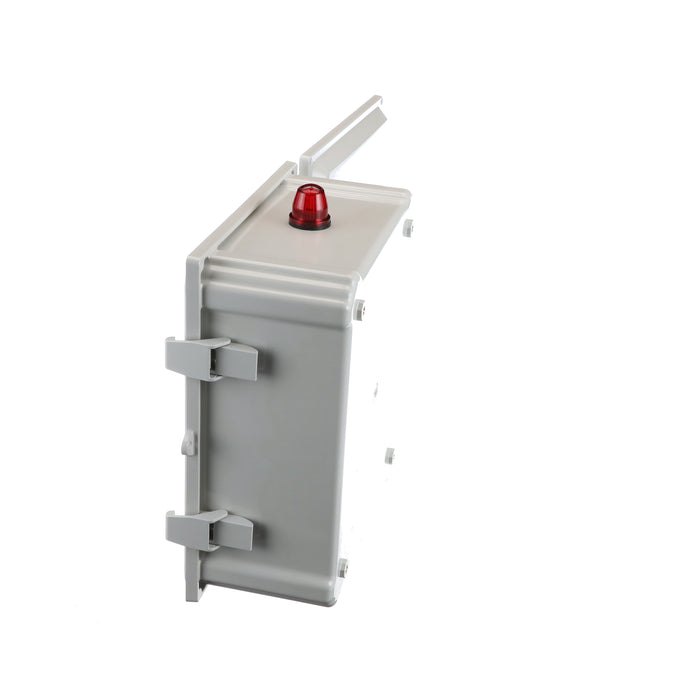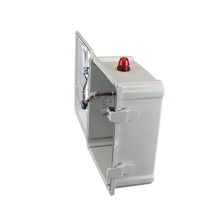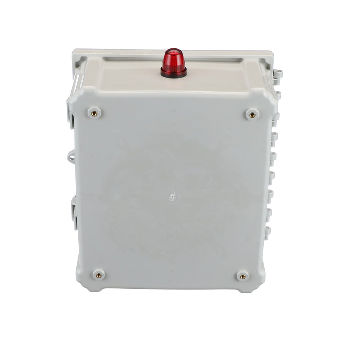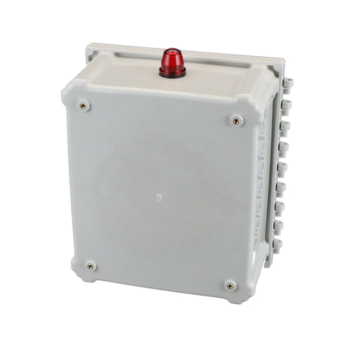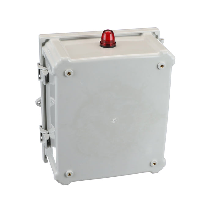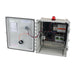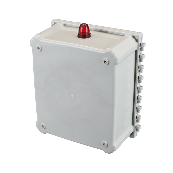 The enclosure has a NEMA rating of 4X which provides protection from falling dirt, falling liquids, hose-directed water and corrosive agents. The 14”x12”x6” enclosure is made of Polycarbonate and has a hinged lockable door with latches and included screws to secure the door if required. All electrical components are mounted inside the enclosure on an aluminium back plate.