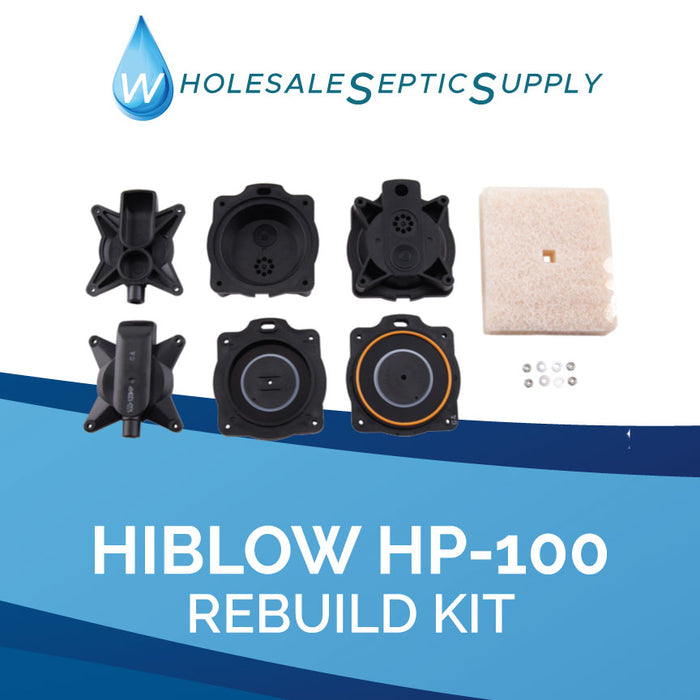 This kit is the perfect solution to fix your Hiblow HP-120 Septic Air Pump. When bought new, the Septic Air Pump costs nearly $500. If your Air Pump is under 10 years old, this is a great solution to get your pump working again, without having to shell out a lot of cash. If your air pump is older than 10, it is recommended you replace it completely. Included items: 2 Diaphragms Mounting Hardware (for diaphragms) 4 Air Valves Mounting Blocks Heads Black Safety Screw Safety Nut for Safety Screw A Brand New Filter