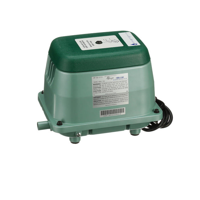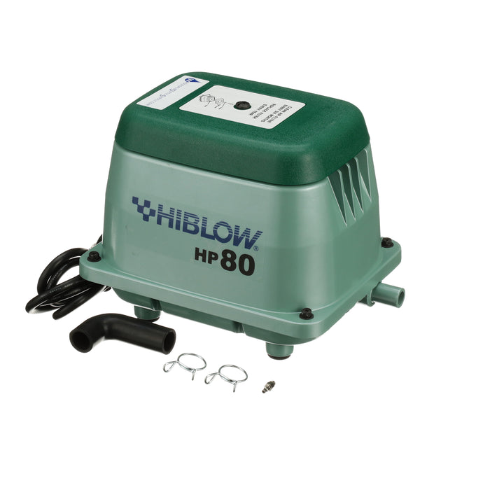 • The Hiblow HP-80 features clean oil-less air, boasts long operational life, offers extremely quiet operation, low vibration, low power consumption, and requires low starting current.If your Hiblow HP series pump won’t turn on when first plugged in, it may have been bumped during shipping, which may have activated the safety slide switch to the position where it deactivates the electric motor. Please refer to the owner’s manual for instructions on how to reset the safety slide switch; you can find an electronic copy of the owner’s manual on the support tab of the Hiblow website.