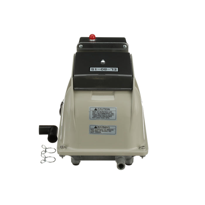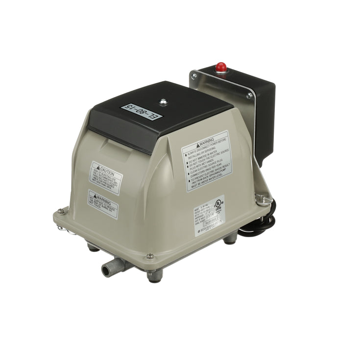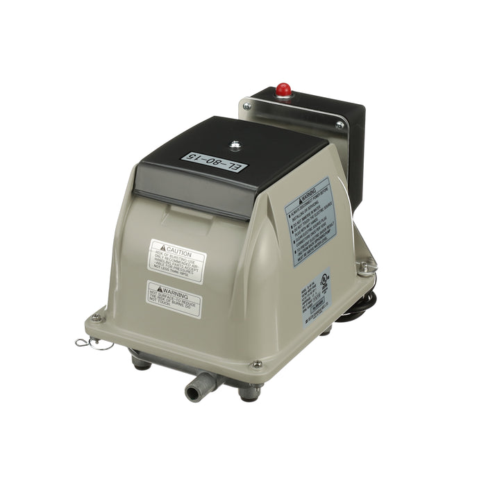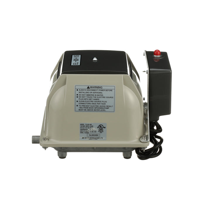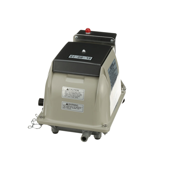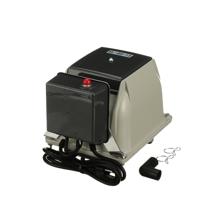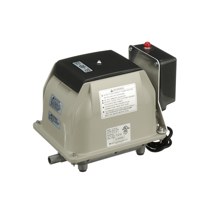 The Secoh EL-80-15-AL is known for its longevity and quietness. The Secoh EL-80-15-AL has a unique rib designed diaphragm that takes the shock away and absorbs more energy than a flat style diaphragm. This allows the air pump to have a long life. The Secoh EL-80-15-AL also has a thermal limiter built into the pump. This allows the contacts to separate when the temperature of the coils reaches 150°C. After the air pumps cools back down, it will start up again automatically.