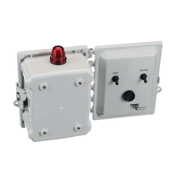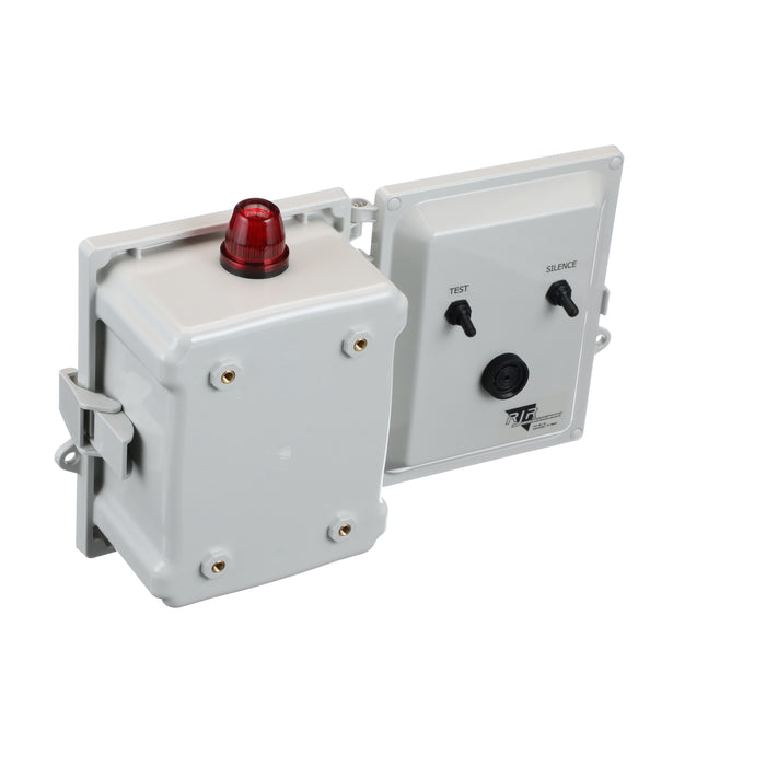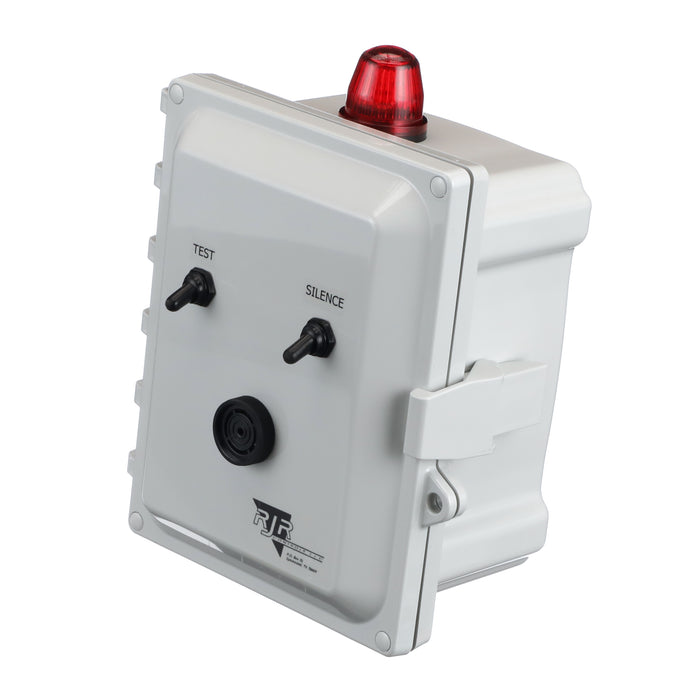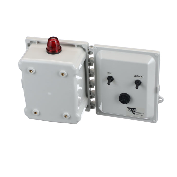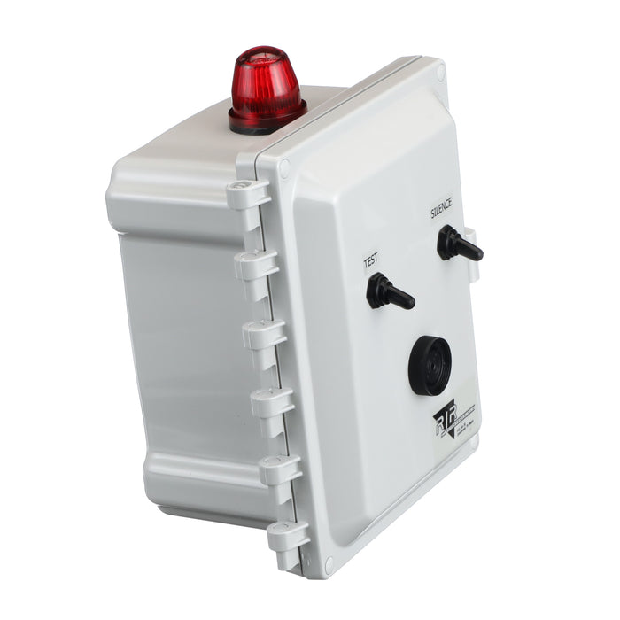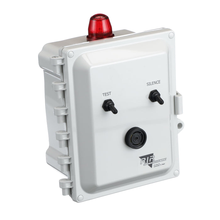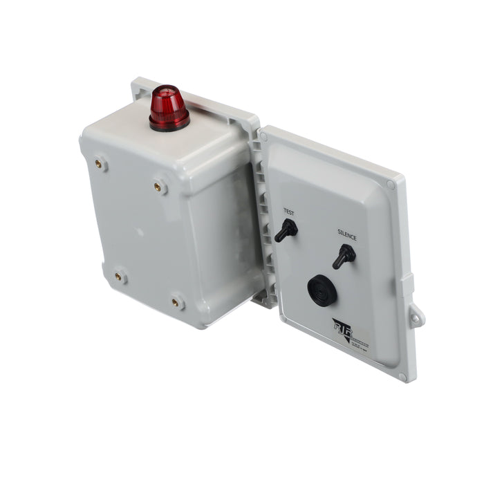 The pump uses a 20 Amp double pole circuit breaker, and the alarm uses a 10 Amp single pole circuit breaker. The alarm is designed to be used with a float switch. When the float switch closes, the 360 degrees top mounted red alarm light will come on, and the Piezoelectric buzzer will sound. There are alarm test and buzzer silence switches mounted in the door of the enclosure. This control can be used to pump sewage from a septic holding tank to a treatment unit or for pumping effluent from a low pressure dosing septic system.