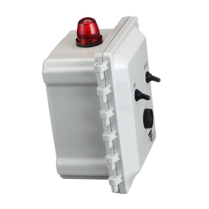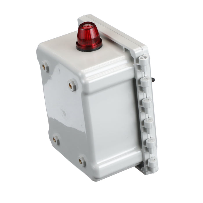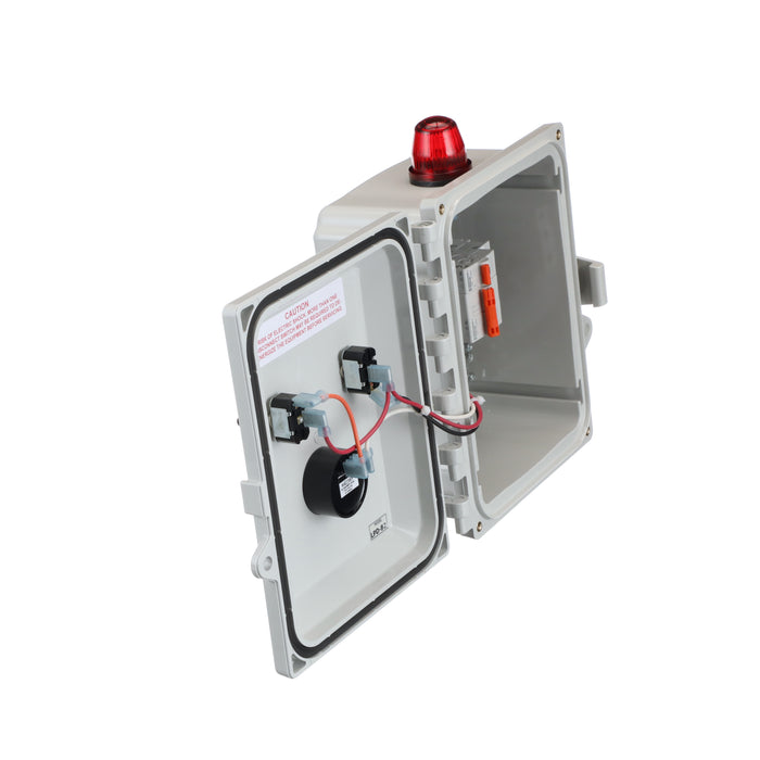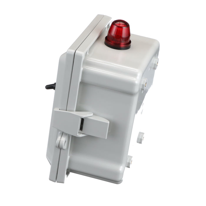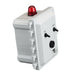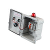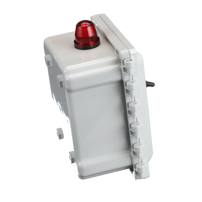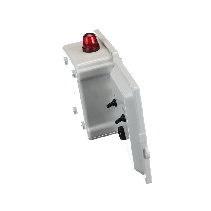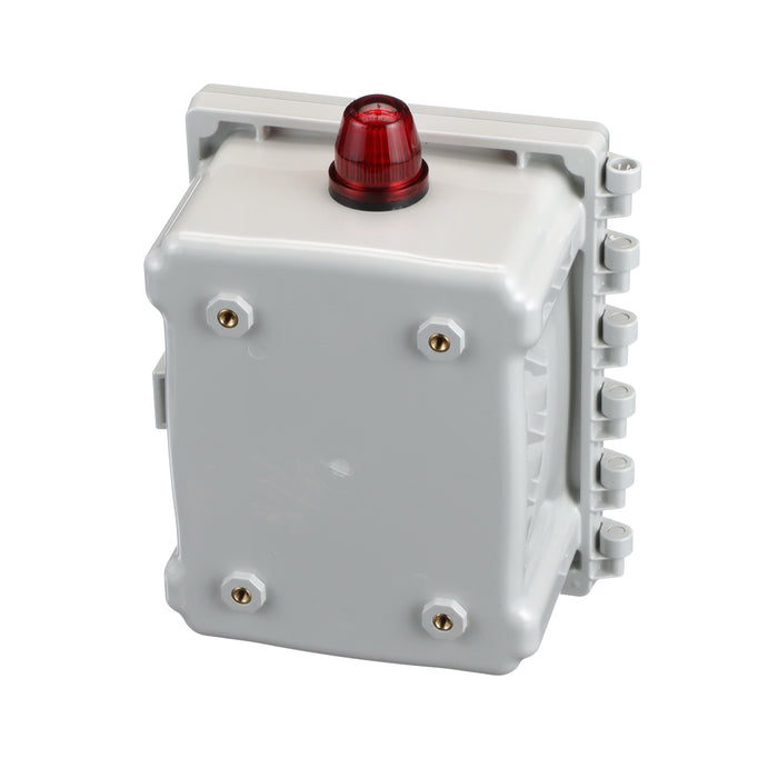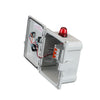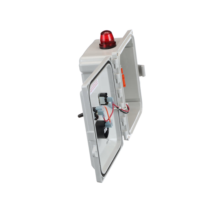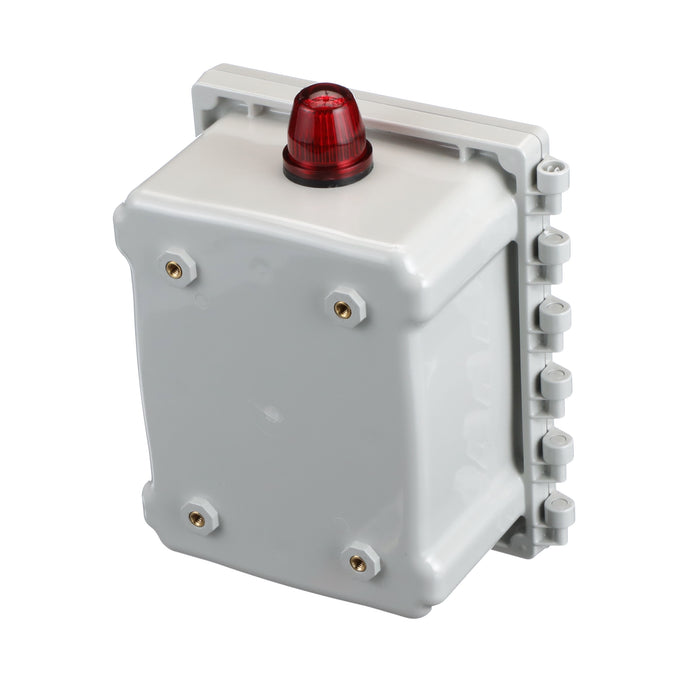 The enclosure has a NEMA rating of 4X which protects from falling dirt, falling liquids, hose-directed water, and corrosive agents. The 8”x6”x4” enclosure is made of Polycarbonate and has a hinged lockable door with latches and included screws to secure the door if required. All electrical components are mounted inside the enclosure on an aluminum back plate.