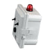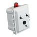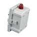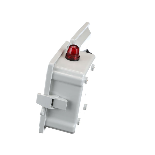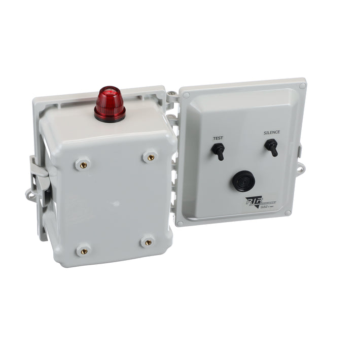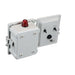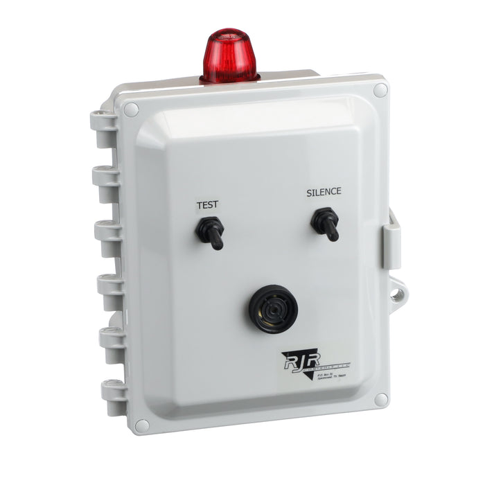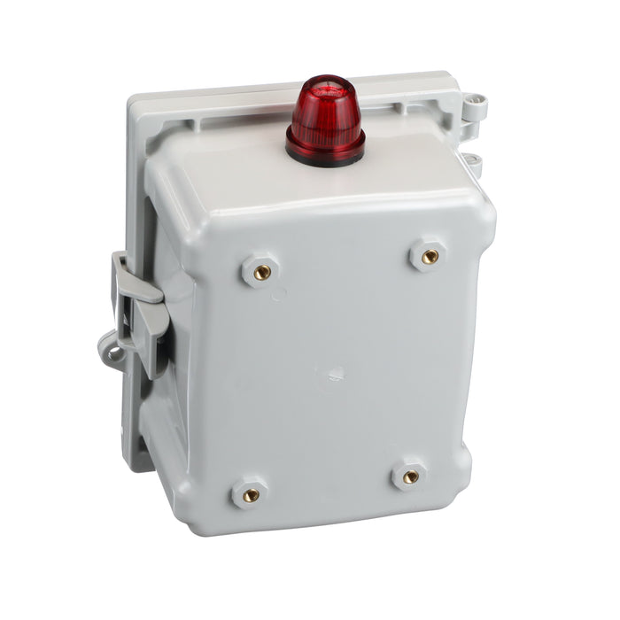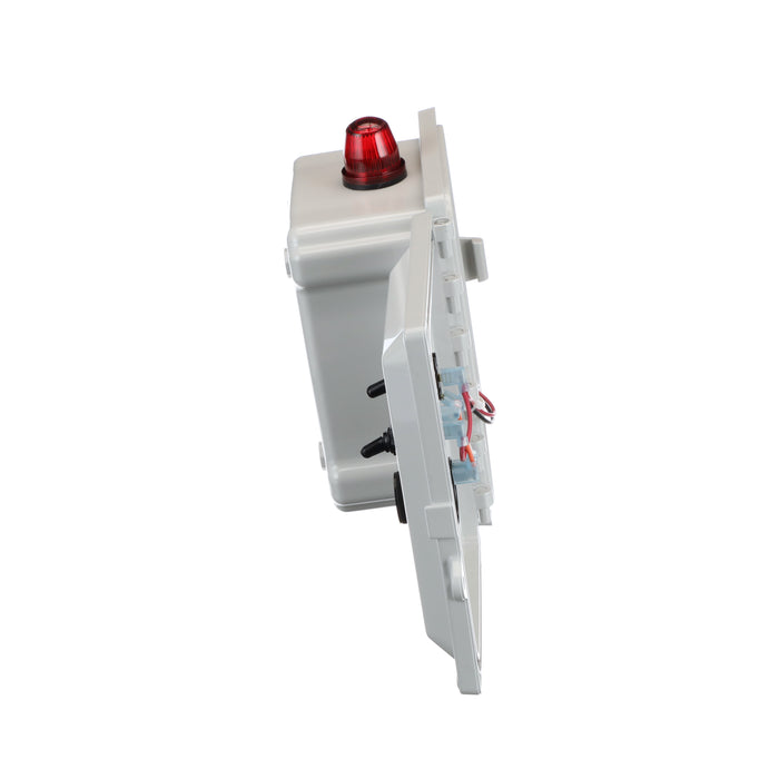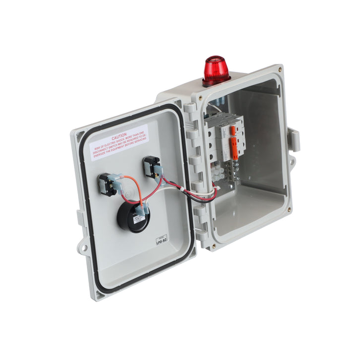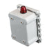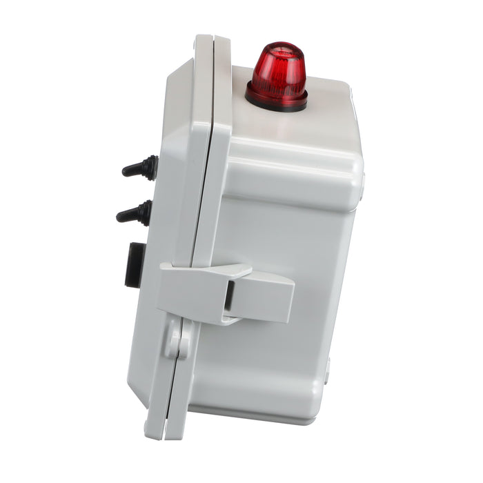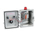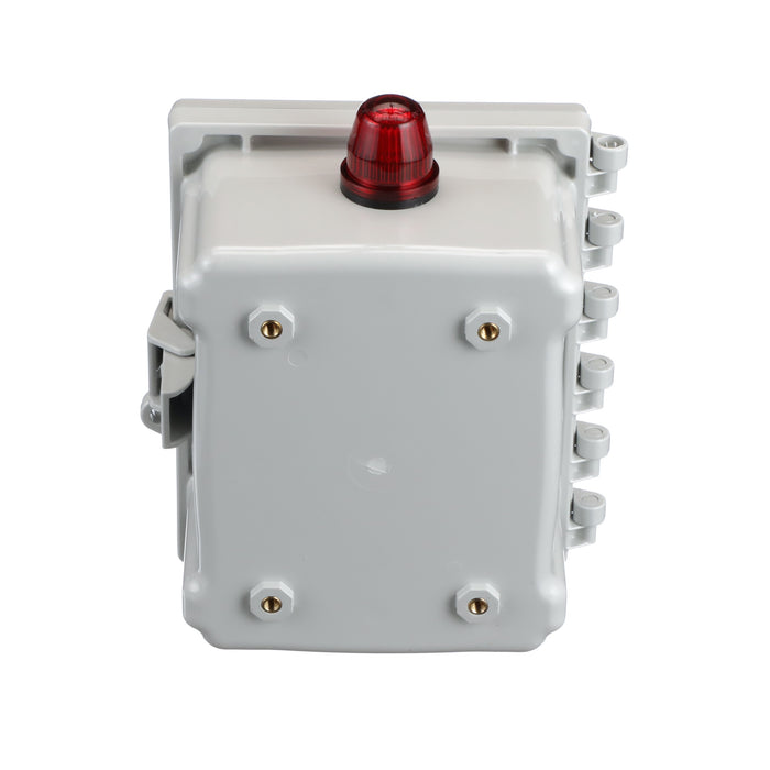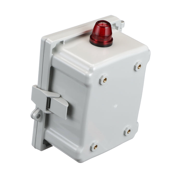 The enclosure has a NEMA rating of 4X which protects from falling dirt, falling liquids, hose-directed water, and corrosive agents. The 8”x6”x4” enclosure is made of Polycarbonate and has a hinged lockable door with latches and included screws to secure the door if required. All electrical components are mounted inside the enclosure on an aluminum back plate.