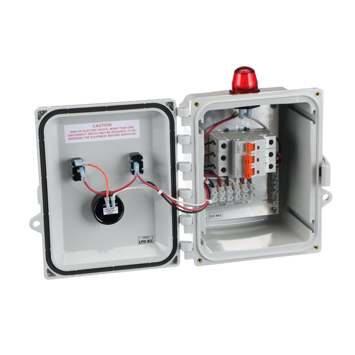 The LPD-B2 is designed to operate a simplex lift station with alarm. This control can be used for pump up or pump down operation. The pump operation is on demand with a two float set up. The two floats are Pump On/Off float and High Water Alarm float. This control does not have a relay, and all pump amperage will go through the On/Off-Pump Float. This control is designed to operate pumps with internal capacitors and a float switch that is already connected to the pump. If using external capacitor pumps, the capacitor kit from the pump manufacturer must be used.
